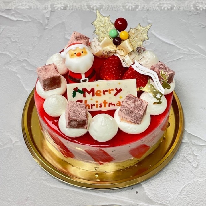 甘酸っぱい苺のムースに生クリームと苺、生チョコを飾りました。