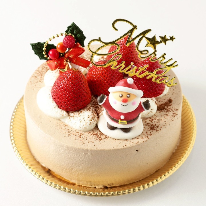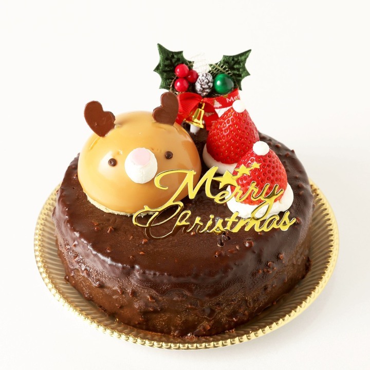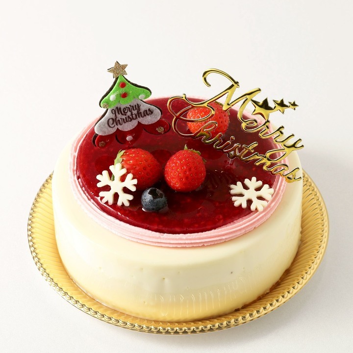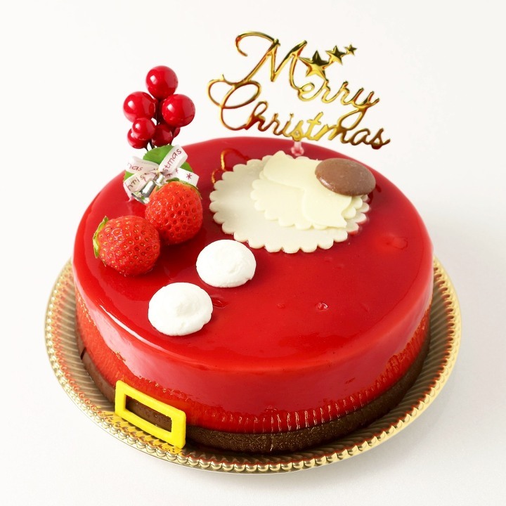 鮮やかなフランボワーズグラサージュに包まれたクリスマスケーキ。